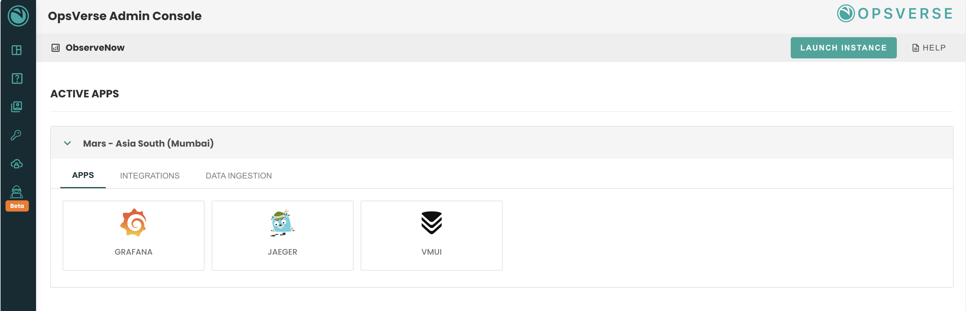 • Within a minute your ObserveNow stack will be up and running and you should see your ObserveNow instance under Active Apps.