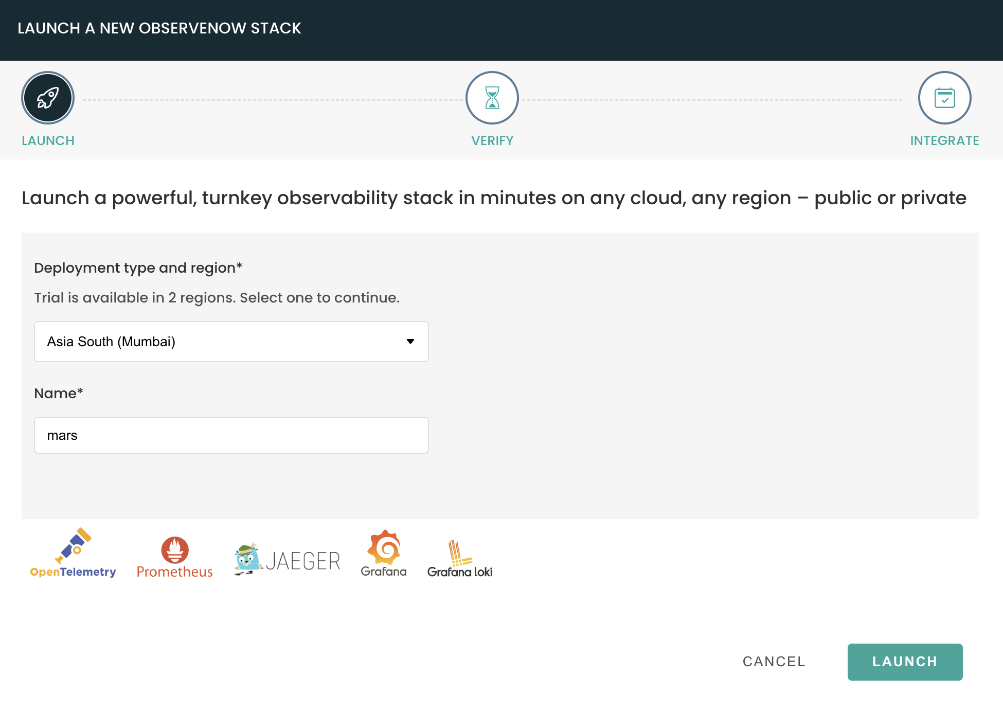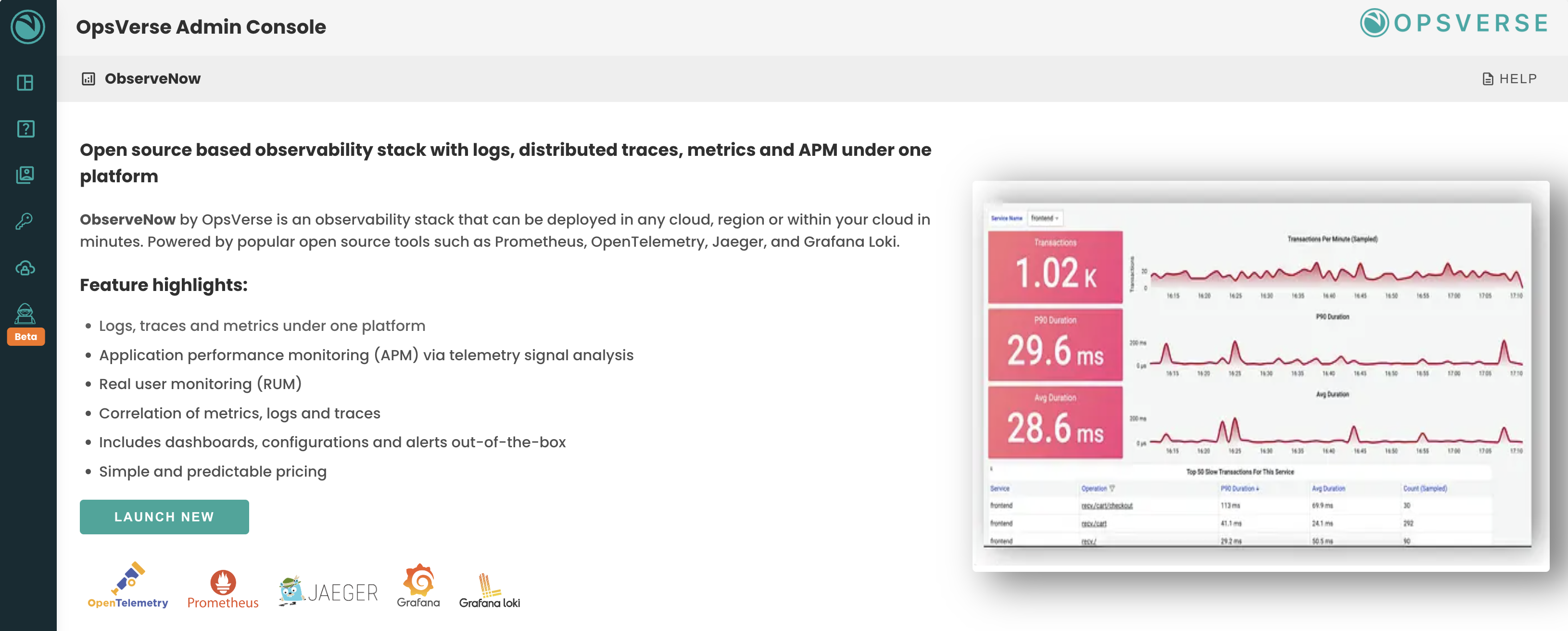 • If you're signing in for the first time, you will see an overview of ObserveNow. Click LAUNCH NEW.